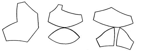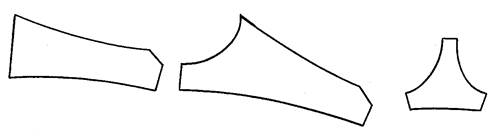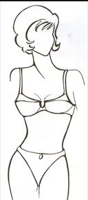 Типовая конструкция бюстгальтера состоит из пояса, чашек и бретелей. Пояс в свою очередь состоит из 2-х или 3-х деталей: передней и двух боковых. Чашки состоят также из двух или трех деталей (рис. 9). На выбор наиболее удобной конструкции чашки бюстгальтера, грации, полуграции влияет форма грудной железы. В литературе выделяют следующие формы грудных желез: плоская, полушаровидная, чашевидная, коническая и отвислая. Правильный подбор конструкции корсетного изделия и формы его чашек в соответствии с возрастом, телосложением, формой грудной железы позволяет сохранить естественные пропорции фигуры и обеспечить удобство изделия в эксплуатации.