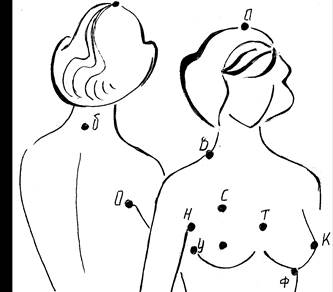 Латеральная (боковая) У - точка на середине боковой линии основания грудной железы (определяется при поднятии руки вверх).