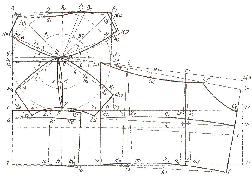 | Раствор передней и боковой вытачек | Ц4М=Ц4М1=Ц5М2=Ц5М3 =0,25Дв | По большой окружности вверх и вниз. Полученные точки соединяют с О2. На пересечении с малой окружностью отмечают точки в, в1, в2, в3. |