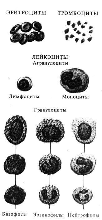 К форменным элементам крови относят эритроциты, лейкоциты и кровяные пластинки (тромбоциты) (рис.3.).