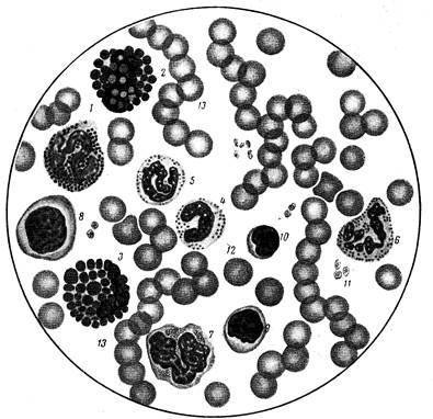 1- базофил; 2 и 3 – эозинофилы; 4- юный нейтрофил; 5- палочкоядерный нейтрофил; 6- сегментоядерный нейтрофил; 7- моноцит; 8- большой лимфоцит; 9- средний лимфоцит; 10- малый лимфоцит; 11- кровяные пластинки; 12 и 13 – эритроциты.