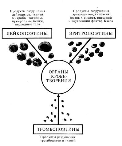 В регуляции лейкоцитопоэза, обеспечивающего поддержание на необходимом уровне общего количества лейкоцитов и отдельных его форм, участвуют вещества гормональной природы - лейкопоэтины. Предполагают, что для каждого ряда лейкоцитов возможно наличие специфических лейкопоэтинов, образующихся в различных органах (легких, печени, селезенке и др.). Лейкоцитопоэз стимулируют нуклеиновые кислоты, продукты распада тканей и самих лейкоцитов.