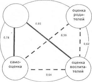 Вторая плеяда (оценка родителей — оценка воспитателей; оценка воспитателей — самооценка; оценка родителей — самооценка) имеет следующую характеристику: