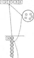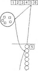 Эстафета «Найди цифре место» с цветными кубиками для составления ряда цифр. Для эстафеты необходим набор больших (с ребром 7 см) кубиков (по 6 кубиков на команду). Каждая грань кубика окрашена в один из шести цветов: красный, синий, желтый, зеленый, оранжевый, коричневый. На гранях, окрашенных одним цветом, наклеены белые цифры от 1 до 6. Таким образом, все одноцветные грани имеет свой цветовой ряд и комбинация цветов и цифр каждого кубика не повторяется. На расстоянии 5—7 м от стартовой линии напротив каждой команды укладываются бумажные полоски длиной 42—45 см (6 кубиков по 7 см), окрашенные в один из указанных цветов (для каждой команды свой цвет) (рис. 8).