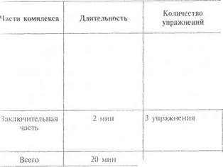 | Части комплекса | Длительность | Количество упражнений | Преимущественная направленность упражнений |
