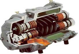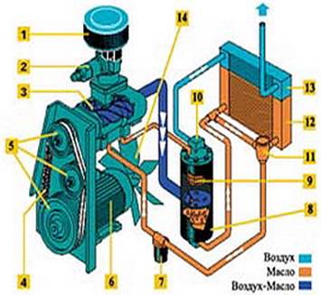 Воздух через всасывающий клапан (2) и воздушный фильтр (1) поступает в винтовую пару (3), которая является "сердцем" компрессора. Здесь он смешивается с маслом, циркулирующим по замкнутому контуру, и образовавшаяся воздушно-масляная смесь нагнетается с помощью винтового блока в пневмосистему. Разделение масла и воздуха происходит в сепараторе (8,9). Очищенный от масла воздух через охлаждающий радиатор (13) поступает на выход компрессора, а масло возвращается в винтовую пару. В зависимости от температуры оно проходит либо по малому кругу, либо по большому, через масляный радиатор (12). Регулировка осуществляется с помощью термостата (11). Винтовая пара приводится в движение электродвигателем (6), а автоматическое включение и выключение компрессора осуществляется с помощью реле давления (16).