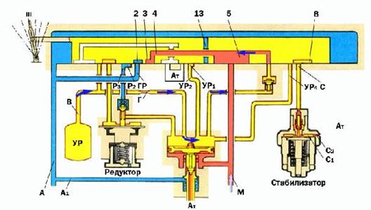 В этом положении ГР не сообщается с ТМ и УР, а ТМ через золотник сообщается с полостью над обратным клапаном. При падении давления воздуха в ТМ под действием большего давления из УР открывается обратный клапан, и УР сообщается с ТМ через открытый этот клапан и канал золотника5. Вследствие такого сообщения падает давление в УР. Давление воздуха под и над уравнительным поршнем будут равными, уравнительный поршень в движение не приходит и не открывает впускной клапан. Обратный клапан не допускает обратного перетекания воздуха из ТМ в УР при постановке ручки из 5 в 3 положение.
