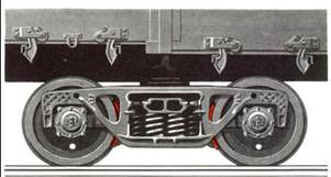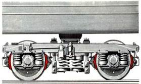 Средние тормозные башмаки, расположенные между колесными парами и поперечными балкам рамы, подвешены на массивных подвесках коробчатого сечения.