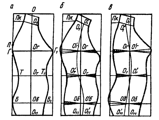| Рисунок 3.5 – Абрисы женских фигур с различной осанкой: а – нормальной; б – сутулой; в - перегибистой |