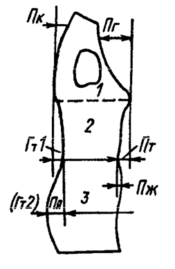 Для более полного описания типов фигур в зависимости от осанки принято три конструктивных пояса: плечевой (П1), корпусный (П2) и подкорпусный (ПЗ). Для их описания используется шесть проекционных размерных признаков (рисунок 3.6): положение корпуса (Пк), положение выступающих точек грудных желез относительно яремной впадины (Пг), глубина талии первая (Гт1), положение талии спереди (Пт), положение живота (Пж), положение ягодиц (Пя) или по-другому глубина талии вторая (Гт2).