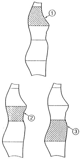 | Плечевой пояс (ПI) располагается между горизонтальными плоскостями: проходящей на уровне седьмого шейного позвонка и проходящей на уровне наиболее выступающих точек грудных желез Корпусный пояс (ПII) располагается между горизонтальными плоскостями: проходящей на уровне наиболее выступающих точек груди и проходящей на уровне талии Подкорпусный пояс (ПIII) располагается между горизонтальными плоскостями: проходящей на уровне талии и проходящей на уровне наиболее выступающих точек ягодиц | |