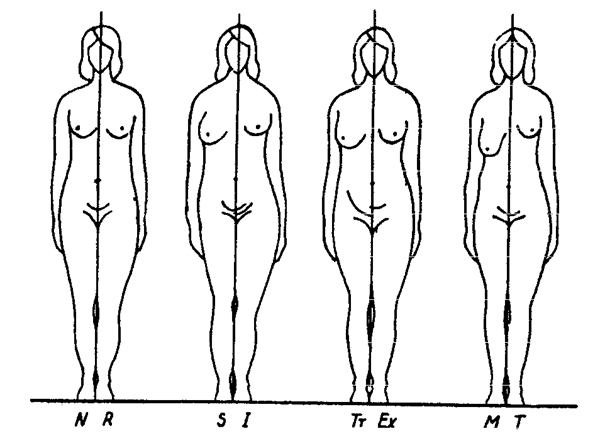 Фигура с нормальной осанкой - это условно-типовая фигура (средний тип). Для женской фигуры с нормальной осанкой характерны слегка наклонная и развитая грудь. Выступающие точки грудных желез расположены несколько ниже уровня подмышечных впадин и выдвинуты вперед относительно выступа живота. Живот обычно овальной формы, расположен ниже линии талии и слегка выдается вперед; выступающие точки ягодиц немного (около 1 см) смещены назад относительно выступающих точек лопаток. Выемка талии и выступ ягодиц умеренные; ноги стройные.