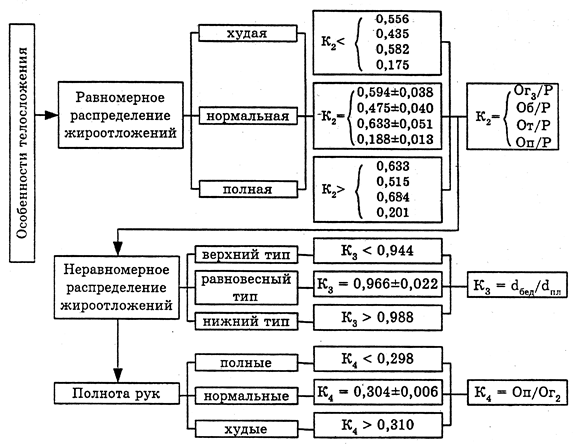 Особенности распределения жироотложений по поверхности тела (верхний, нижний, равновесный типы) определяют по величине коэффициента К3 (отношение поперечного диаметра бедер к плечевому диаметру).