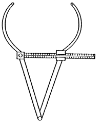 | Большой толстый циркуль – прибор для измерения диаметров фигуры. Представляет собой два металлических стержня, у основания скрепленных винтом, который позволяет раздвигаться стержням подобно ножкам циркуля. К левому стержню в месте перехода прямой его части в дугообразную винтом крепится линейка, к правому стержню - муфта с указателем. При измерении линейку необходимо вставить в муфту. Стержни раздвигаются, касаясь концами измеряемого диаметра. Размер измеряемого диаметра читают на линейке напротив указателя. | |