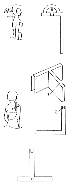 | Проекционные размерные признаки измеряют с помощью специальных линеек: - линейка с гониометром для измерения глубины изгиба позвоночника; - линейка для измерения глубин на уровне лопаток: 1 – насадка для установления прибора в вертикальном положении; 2 – ручка - линейка для измерения глубин на линии талии | |
