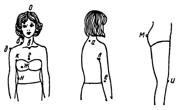 Перед снятием измерений основные антропометрические точки (шейную, плечевую, точку основания шеи, сосковые точки) можно наметить булавками на одежде заказчицы или отметить карандашом на теле.