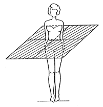 | Фронтальная плоскость проходит вертикально и делит тело на переднюю и заднюю части | |
