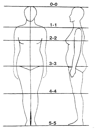 Антропометрический анализ индивидуальной фигуры и сравнение ее с типовой и идеальной имеют важное значение для выбора предпочтительного варианта конструкции одежды. Строение фигуры целесообразно рассматривать в профильной и фронтальной проекциях по различным антропометрическим поясам (рисунок 3.15):
