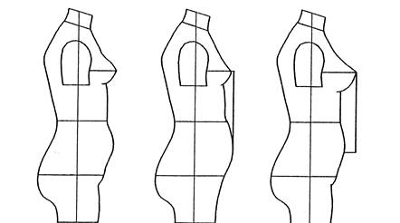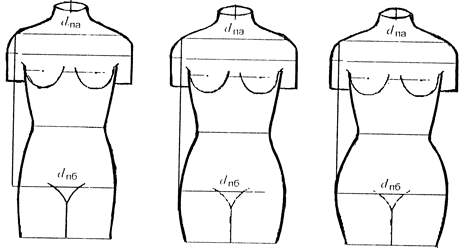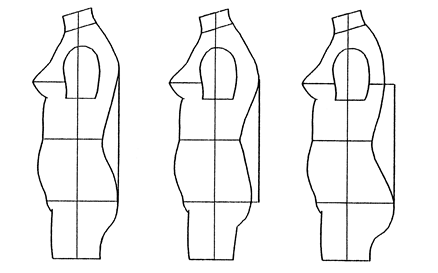Форму тела в профиль со стороны переда определяет соотношение величины выступания грудных желез или живота. Если величины выступания грудных желез и живота примерно равны, то фигура относится к равновесному типу, при выступающем животе – к брюшному, при выступающих грудных железах – к грудному типу (рисунок 3.17).