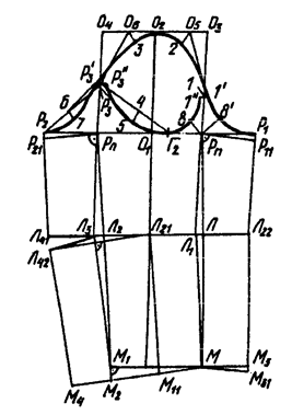 В рукаве с прибавкой к обхвату плеча меньше 5 см для платья приращение к ширине оката в точке 1 увеличивают на 0,2 см на каждый 1 см уменьшения прибавки к обхвату плеча (Поп).