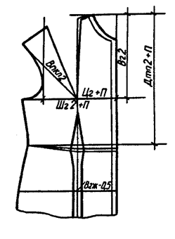 • недостающую величину в измерении Сг2 добавляют к ширине переда на уровне выступающих точек грудных желез. Для проверки ширины изделия на данном участке используют дополнительное измерение Шг2. Раствор вытачки проверяют по формулам: 2 (Сг2 - Cгl) + 2,0 и 2 (Шг2 - Шг) + 2,0. Если растворы вытачки, рассчитанные по этим формулам, не совпадают, то берут среднюю величину;