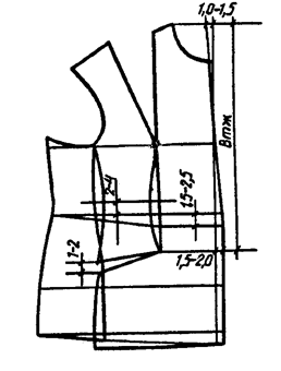 • от линии отрезного бочка на уровне высшей точки живота проектируют вытачку с раствором 1,0 - 2,0 см за счет удлинения переда по срезу притачивания бочка. Переднюю вытачку при этом несколько уменьшают. Для маскировки вытачки ее переводят в конструктивные линии или в прорезь бокового кармана. В изделиях из тканей, поддающихся влажно-тепловой обработке (ВТО), проектируют сутюжку.