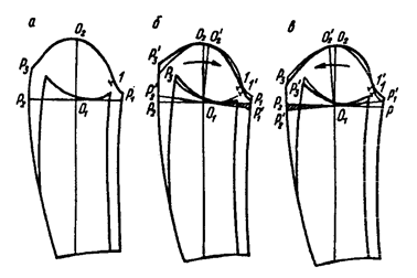 • на перегибистую фигуру преобразования производят аналогичным путем, но в обратном порядке в соответствии с величинами отклонений в осанке (рисунок 6.10, в). Верхняя надсечка смещается назад.