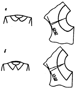 Можно также сделать отведение линии втачивания плосколежащего воротника от горловины на участке спинки. Такое отведение, равное 1,0 -1,5 см, образует стойку высотой 1,0 - 1,5 см (рисунок 7.4, а).