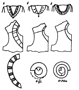 Для построения конструкции волана или оборки используют чертежи спинки и переда, совмещенные по плечевым срезам. На этих деталях сначала строят плосколежащий воротник. Его отлет соответствует внешнему контуру волана. Затем воротник копируют на бумагу. Полученный шаблон разрезают на части в местах образования фалд и разводят (рисунок 7.19, а). Величина разведения зависит от модели и свойств материала (жесткости, драпируемости). Волан, сходящий на нет, можно построить и в виде улитки (рисунок 7.19, б). Длинный волан или оборку также можно построить в форме улитки. Ширина детали зависит от модели (рисунок 7.19, в).