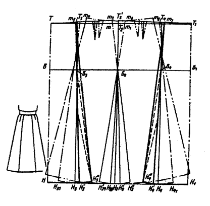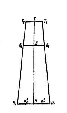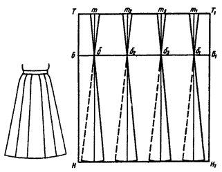 Через точки Т, Б и Н влево и вправо проводят горизонтальные линии, на которых откладывают отрезки, равные ширине клина на уровне линии талии: T1T2 = (Ст + Пт) / 0,5 n (n - число клиньев в юбке).