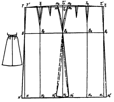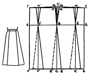 Для большего расширения срезы переднего и заднего клиньев юбки оформляют прямыми линиями на продолжении сторон вытачек до пересечения с линией низа в точках Н3" и Н4". В этом случае расширение юбки начинают с концов вытачек, поэтому увеличивают прибавку по линии бедер (Пб); при этом Н3Н3" = Н4Н4" ≤ 8,5 см.