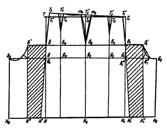 При оформлении линии переднего среза предварительно проводят линию через точки Т1' и Б1. Пересечение с линией низа обозначают точкой H1', с линией сидения – Я1'. При этом Т1Т1' = 1,0 см;