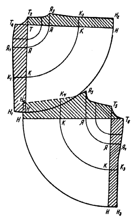 Чертеж такой конструкции может быть построен на основе конструкции длинных брюк путем конического разведения передней части по линии сгиба. Разведение выполняется на величину, необходимую для образования в точке Т между шаблонами прямого угла (рисунок 8.25).