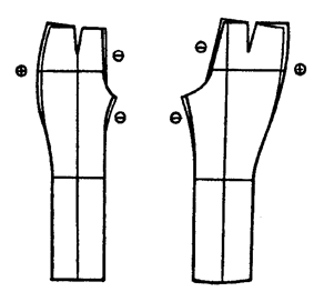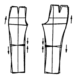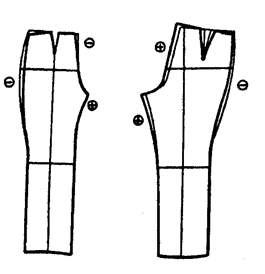 Величина изогнутости принимается равной 3/4 от величины расхождения ног в колене. Брюки расширяют на участке колена. Заднюю часть брюк изменяют аналогично передней. При заутюживании сгибов брюк учитывают несовпадение линий бокового и шагового швов.