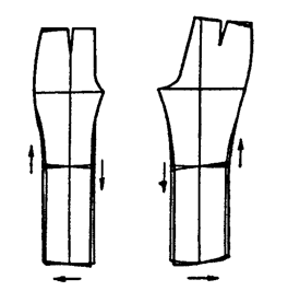 При конструировании брюк на фигуры со спрямленным тазом среднюю линию передней части удлиняют на 1,0 см, а среднюю линию задней части укорачивают на 1,0 - 1,5 см, поворачивая при этом верхние контуры передней и задней частей брюк по линии измерения обхвата бедер, как показано на рисунке 8.28.