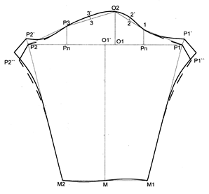 • предусматривают оттяжку по передней Р1''М1 и локтевой Р2''М2 нижним линиям рукава (на чертеже пунктирная линия), а также в нижней части оката рукава