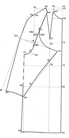 Нижняя линия М5Р2' – с прогибом в 1,0÷2,0см., линия низа М4М5 с выпуклостью 0,3÷ 0,7см в зависимости от ширины рукава внизу.