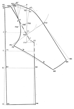 Радиусом А21'П32 дуга влево, пересечение которой с линией проймы спинки обозначают точкой П32'. От нее по дуге