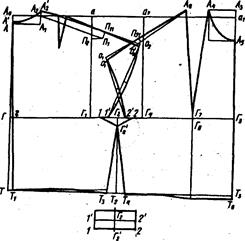 Рисунок 9.22 – Чертеж конструкции с коротким цельнокроеным рукавом и прямоугольной ластовицей | Для того чтобы обеспечить припуск на шов втачивания ластовицы, от точки Г2 откладывают 1,5 - 2,0см,т.е. Г2Г2' = 1,5 - 2,0 см; точку Г2' соединяют с точками 1 и 2 прямыми линиями. Боковые линии спинки и переда – прямые Г2'Т3 сп = Г2'Т4 п. Построение ластовицы: · ширина ластовицы 1-2 = 1Г2' + Г2'2; · высота - 1-11 = 2-2' (с чертежа проймы). |