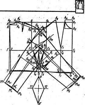 Верхнюю линию передней части рукава проводят через точки А9, П51, О11, Л, М11 плавной выпуклой линией в области плеча П51 О11.