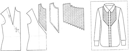 Нагрудные вытачки на переде располагают в месте положения крайней складки (рисунок 10.13) или переводят ее в другие контуры вне плоскости складок (рисунок10.12).