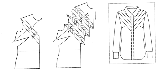 При проектировании складок по всей длине деталь «разрезают» в местах расположения складок и раздвигают на запроектированную величину в направлении, перпендикулярном направлению складок (рисунки 10.11-10.12). Величину раздвижки шаблона для одной складки рассчитывают как ее удвоенную глубину. Например, при глубине складки 3,0 см величина раздвижки равна 3,0х 2 = 6,0 см.