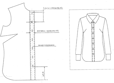 Расположение петель рассматривают как по отношению к линии полузаноса, так и по отношению к верхнему и нижнему краям изделия. В изделиях с центральной застежкой (рисунок 10.15) петля должна заходить за линию полузаноса на 0,3 - 0,5 см (в зависимости от толщины пуговицы) в сторону борта, чтобы «ножка» пришитой пуговицы в застегнутом изделии оказалась точно на линии полузаноса.