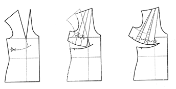 Линии подреза, как правило, проходят под или над выпуклыми контурами фигуры, не проходя и не доходя до концов вытачек. Открываясь во второй линии подреза, отсеченная их часть оформляются в виде сборок или защипов, направленных на выпуклость. Если раствор открывшейся вытачки оказывается недостаточным, его дополнительно увеличивают коническим расширением. Окончательные контуры оформляются плавными кривыми линиями. При сложных вариантах конструктивного моделирования окончательные контуры деталей могут определяться муляжным способом после закладывания проектируемых складок, драпировок и т.д.