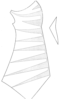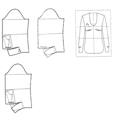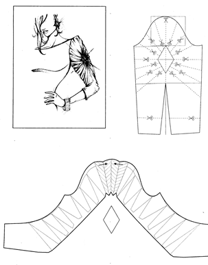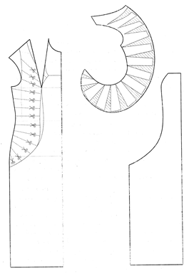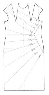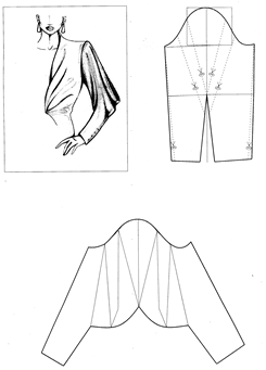При разработке деталей с драпировкой в нее сначала переводятся растворы всех вытачек, затем намечают линии и направление разрезов с последующей раздвижкой на проектируемую величину конического расширения. Для улучшения драпировочных свойств рекомендуется раскрой деталей по «косой нити».