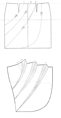 Для оформления среза детали, от которого проектируется сложная драпировка, необходимо выполнить макет этой детали, заложив запроектированные драпировки-складки. Затем линию среза уточняют по шаблону исходной детали. Можно также использовать прием оформления срезов в зависимости от направления закладывания складок (по аналогии с оформлением срезов деталей с вытачками в зависимости от направления их заутюживания.