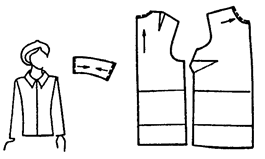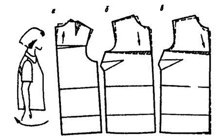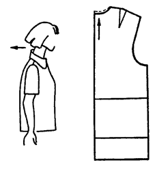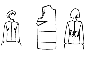 Короткая спинка приводит к тому, что изделие как бы повернуто в сторону спинки. Передние детали в распашных изделиях внизу расходятся; воротник отстает от шеи, и спинка вздернута внизу; боковые швы смещены назад (рисунок 11.1).