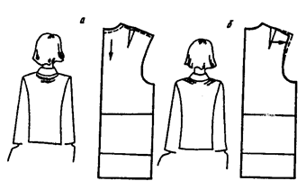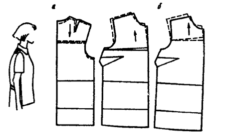 Горизонтальные складки под воротником на спинке образуются при удлиненности средней части спинки от линии горловины до линии проймы и одновременно слишком большом наклоне плечевых срезов (увеличивают глубину горловины спинки и уменьшают наклон плечевых срезов (рисунок 11.9, а), при покатых плечах уменьшают наклон плечевого среза спинки (рисунок 11.9, б)).