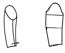 Может наблюдаться вздергивание низа короткого рукава. Причиной является также недостаточная высота оката. В этих случаях увеличивают йысоту оката рукава или углубляют рукав в нижней части его оката.