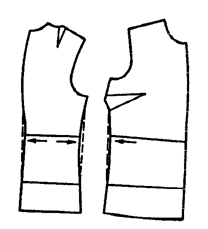 Короткий перед приводит к тому, что в готовом изделии передние детали внизу вздернуты вверх и заходят одна на другую; от горловины к боковому шву идут косые заломы; воротник отстает от щей. Для устранения дефекта удлиняют верхнюю часть переда или перемещают его вверх вдоль бокового шва.